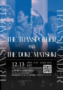 開場 17:30 開演 18:00 入場無料(ワンドリンク制) 出演:とらんすぽんだぁ、ゲスト:The "Duke"Matsuki